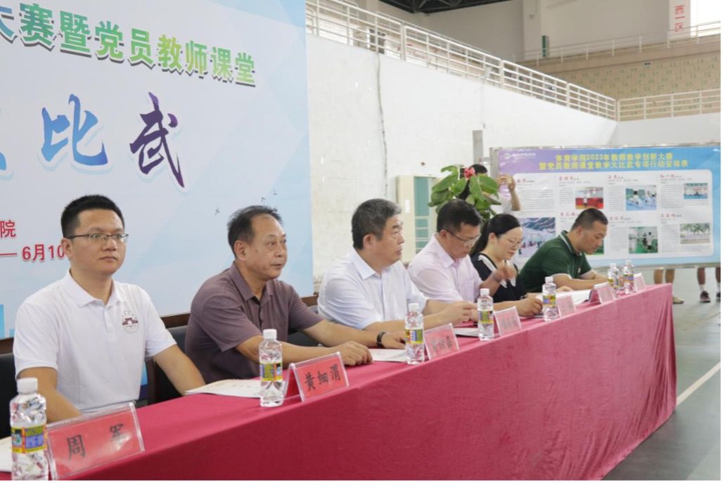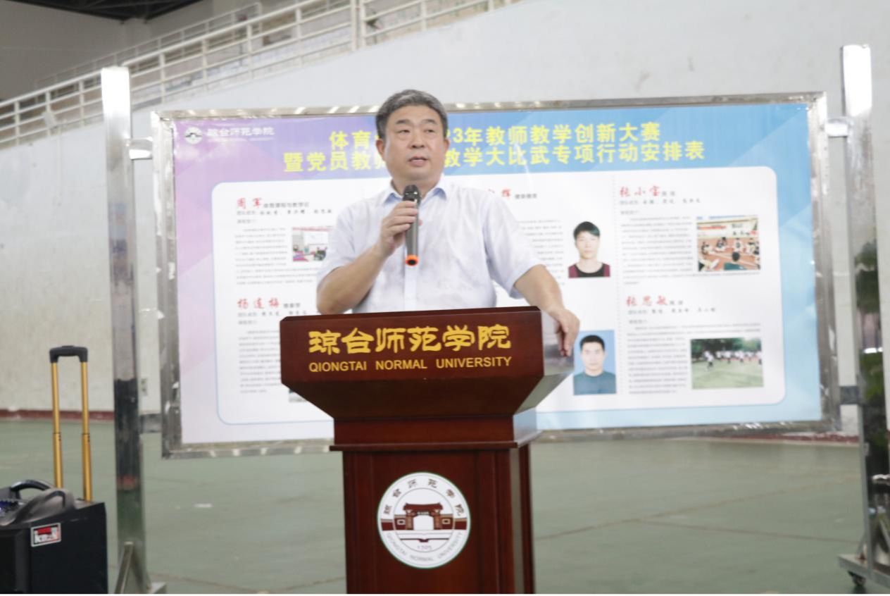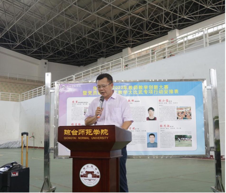 为落实立德树人根本任务,深化教育教学改革,进一步提升体育学院全体教师课堂教学能力和业务水平,不断更新教育理念、创新教学模式、提高教学质量,促进教师专业成长。2023年5月23日下午14:20,体育学院在体育馆举办教师教学创新大赛暨党员教师课堂大比武启动仪式。出席本次活动的领导有琼台师范学院副校长银海强、教务处副处长黄细渭、教务处副处长袁霞、体育学院院长云颖、体育学院党总支书记符传嘉、体育学院副院长贺昆、体育学院副院长周军以及体育学院全体教师和体育学院全体学生。
