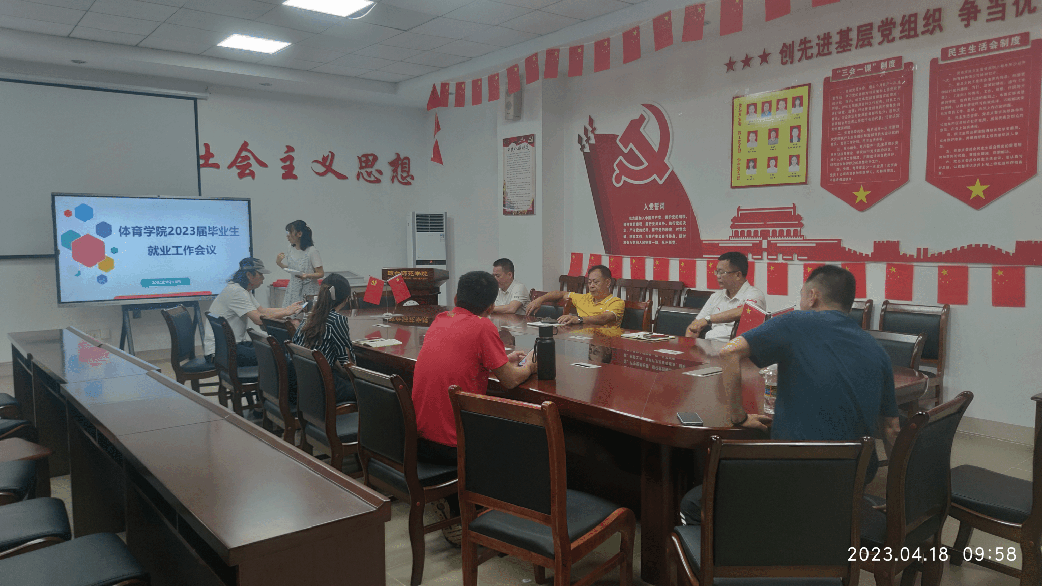 为落实党中央、国务院“稳就业”“保就业”的决策部署,破解学院就业工作难题,推进2023届毕业生顺利就业,2023年4月18日上午9:30,体育学院在党建活动室召开2023届毕业生就业工作会议。体育学院党总支书记符传嘉、云颖院长、周军副院长、全体辅导员以及毕业班班主任共同参会。