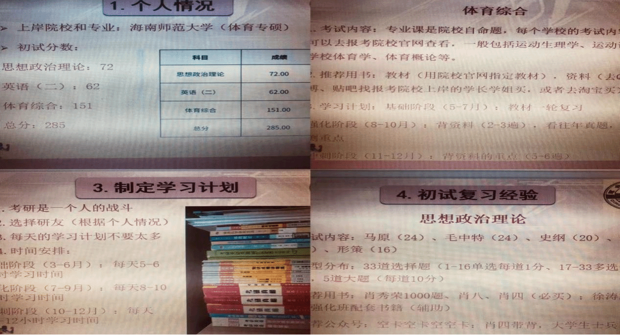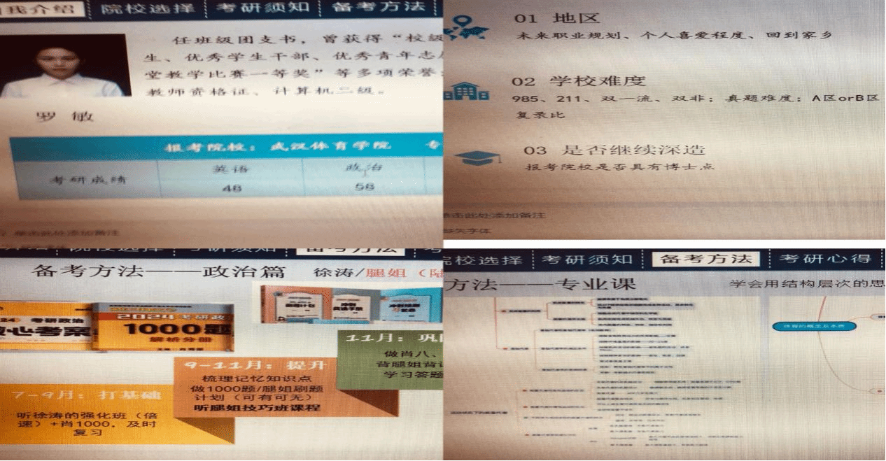 第一个发言的是成功考入武汉体育学院的罗敏同学,她从自我介绍、院校选择、考研须知、备考过程、考研心得五个方面给大家带来满满的干货。