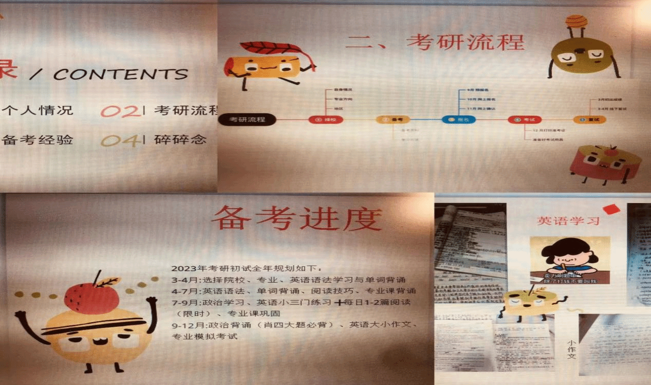 紧接着,考入湖北大学的周俊池同学从个人情况、考研流程、备考经验、碎碎念四个方面和大家做了分享。提醒我们在报名考试前要时刻关注网上信息,同学之间要互相告知,避免出现因忘记报名而错过考试的现象发生。如果经济条件允许可以找上岸学长、学姐做专业辅导规划,考研前期要根据自身情况,选择一所适合的院校去挑战自我。同时对于英语底子基础薄弱的同学,建议语法单词一起学,不断地刷知识点。最后建议同学们形成良好的习惯,注意要劳逸结合,尽量让考研效果更加高效。