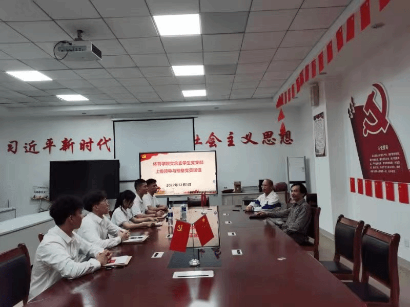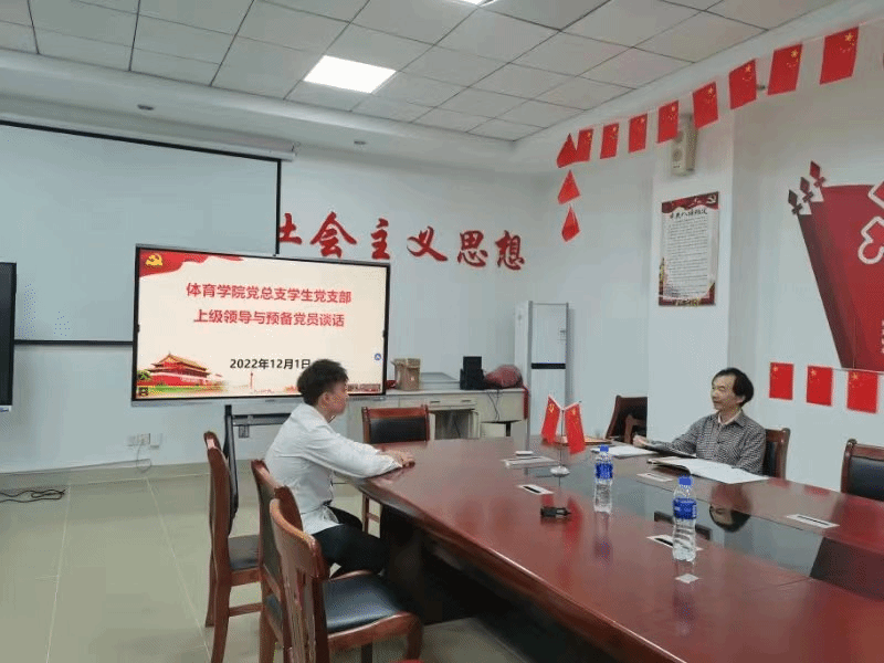 2022年12月1日下午15:00,受党委指派,特邀党建组织员王立紫、姚振学两位同志,对体育学院2022年下半年新发展的7位同志进行一对一谈话。谈话内容主要是了解其对党的认识、入党信念、入党动机,思想觉悟和对党的基本知识掌握情况,以及对待入党的态度和决心等,并有针对性地对其进行教育和指导,并审阅相关同志的入党材料。