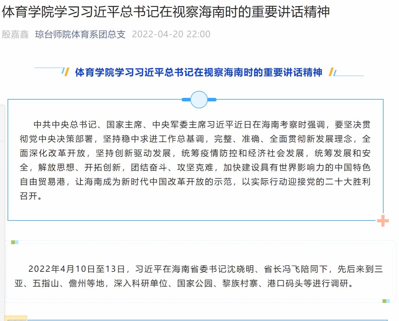 去年4月,习近平总书记来到海南,深入科研单位、国家公园、黎族村寨、港口码头等进行调研。体育学院迅速掀起学习热潮,全院师生深入学习领会习近平总书记在海南考察时的重要讲话精神,将习近平总书记对海南的殷殷嘱托化作更强的信心、更大的干劲,切实增强服务海南自贸港建设的思想自觉和行动自觉。