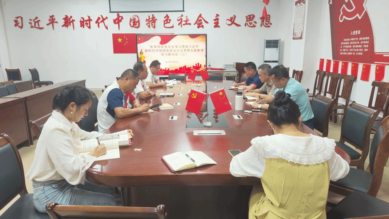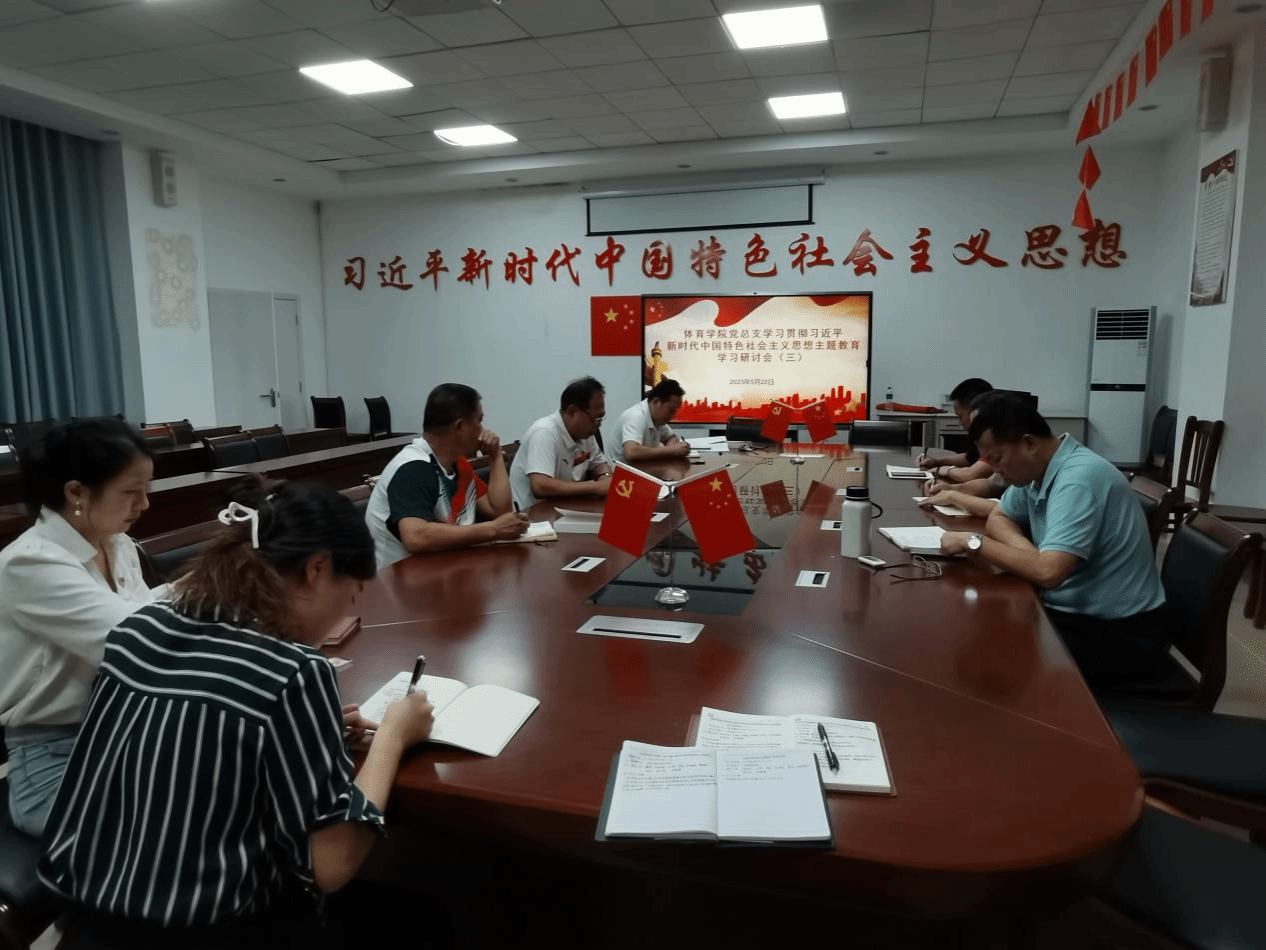 2023年5月23日上午10:30,体育学院党总支在党建办公室组织开展习近平新时代中国特色社会主义思想主题教育专题研讨会,参加本次研讨会的有第三巡回指导组组长蔡青、体育学院党总支书记符传嘉、体育学院院长云颖、体育学院副院长周军、教工党支部书记符智勇、学生党支部书记尹丽、教工支部支委黄昌光、学生支部支委张方琴、辅导员许晓倩。