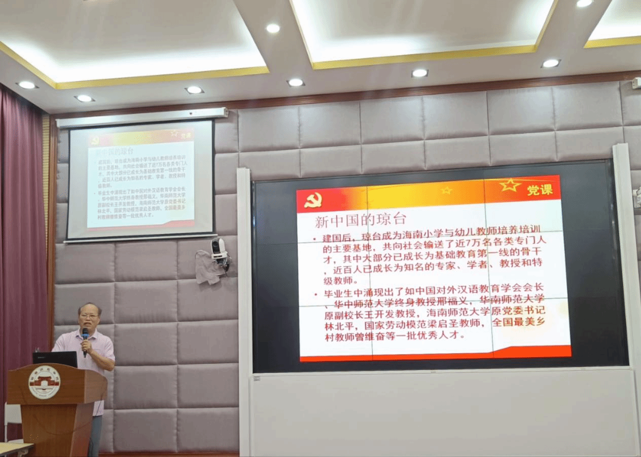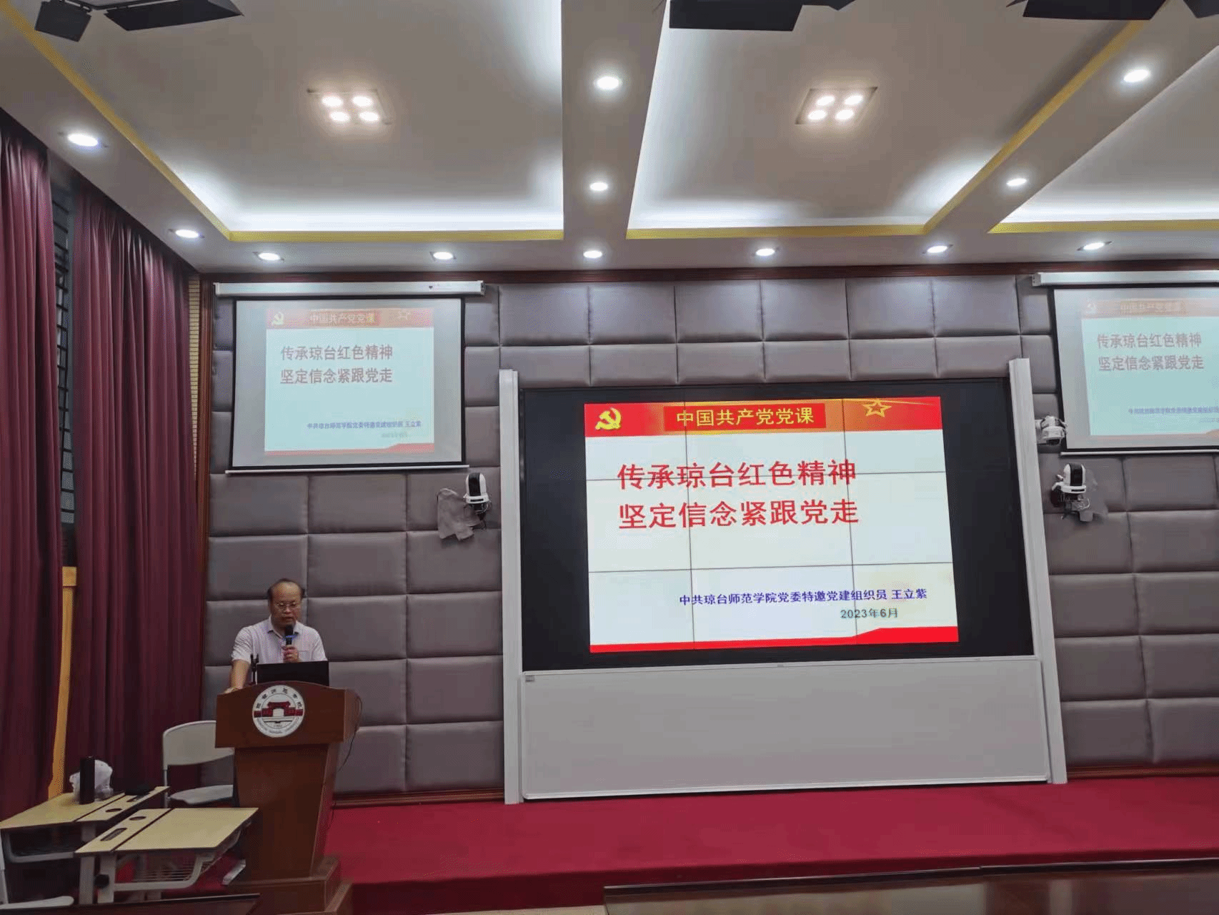 王教授立足琼台的悠久历史和辉煌的革命传统,讲述了琼台师范学院作为红色摇篮,为琼崖革命的胜利孕育革命思想、创建党组织、培养党员干部的红色故事,展示了琼台“三百年书声不断”成为海南省小学和幼儿园师资培养培训的主要基地的奋斗历史,展望新时代下琼台儿女继承遗志,弘扬琼台革命先驱的革命精神,延续“无负海山,敢为琼先”的传统和勤奋、严谨、求实、创新的学风!