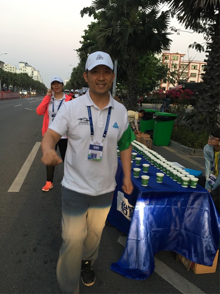饮料站主裁判梁冬老师正在工作