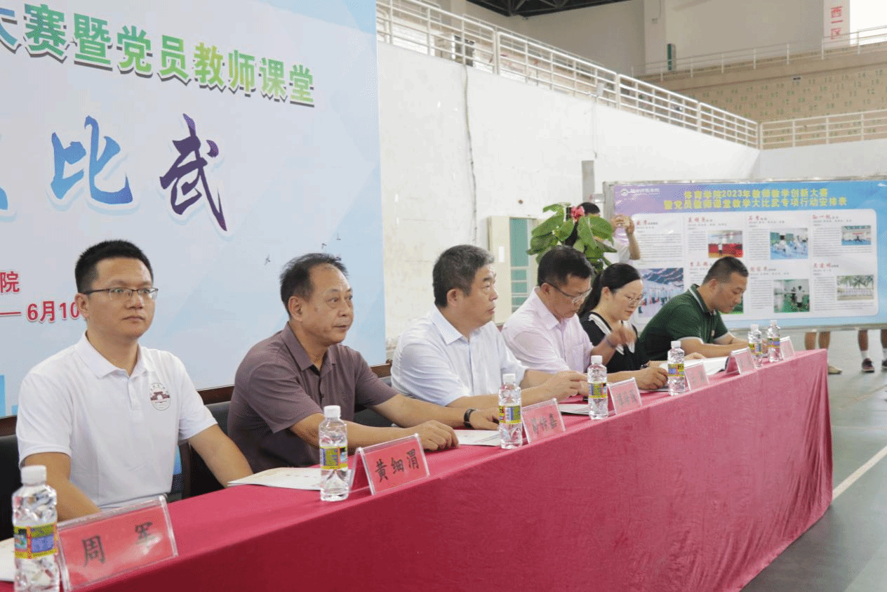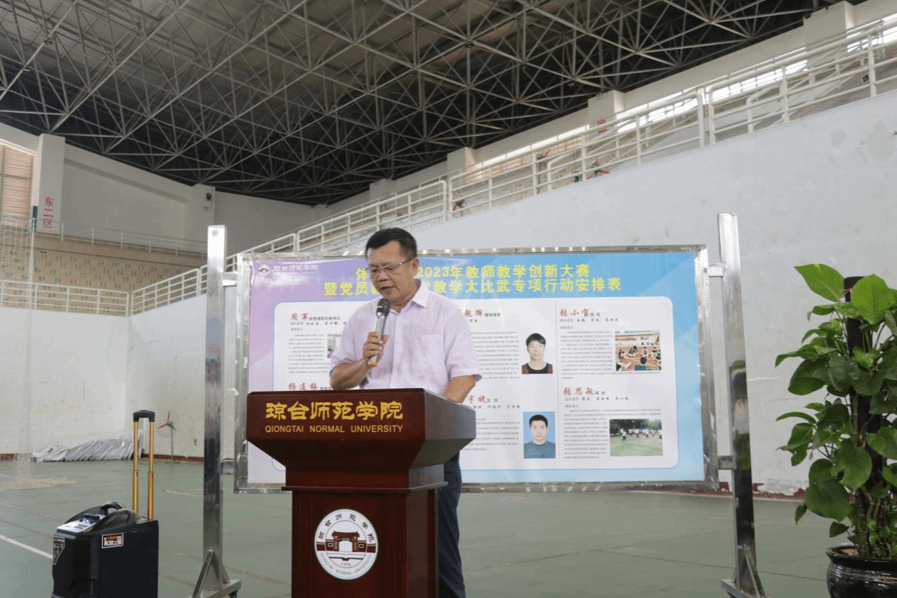 2023年5月23日下午14:20,体育学院在体育馆举办教师教学创新大赛暨党员教师课堂大比武启动仪式。出席本次活动的领导有琼台师范学院副校长银海强、教务处副处长黄细渭、教务处副处长袁霞、体育学院院长云颖、体育学院党总支书记符传嘉、体育学院副院长贺昆、体育学院副院长周军以及体育学院全体教师和体育教育专业全体学生。