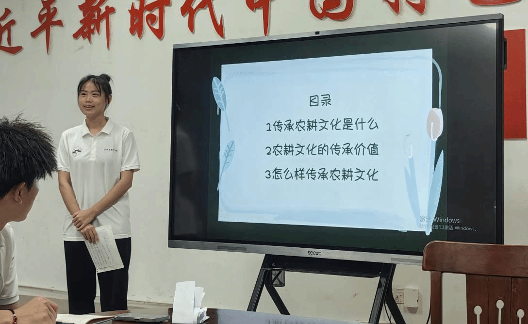 王昕萍同学着重讲述了传承农耕文化,中国是名列世界第一的农业大国。她从三点进行讲述:传承农耕文化是什么、农耕文化的传承价值、怎么样传承农耕文化。农业本身具有的调节生态、田园风光、观光休闲和文化传承的多样性功能被忽视。农耕文化是中华文化的根,贯穿中国传统文化的始终。