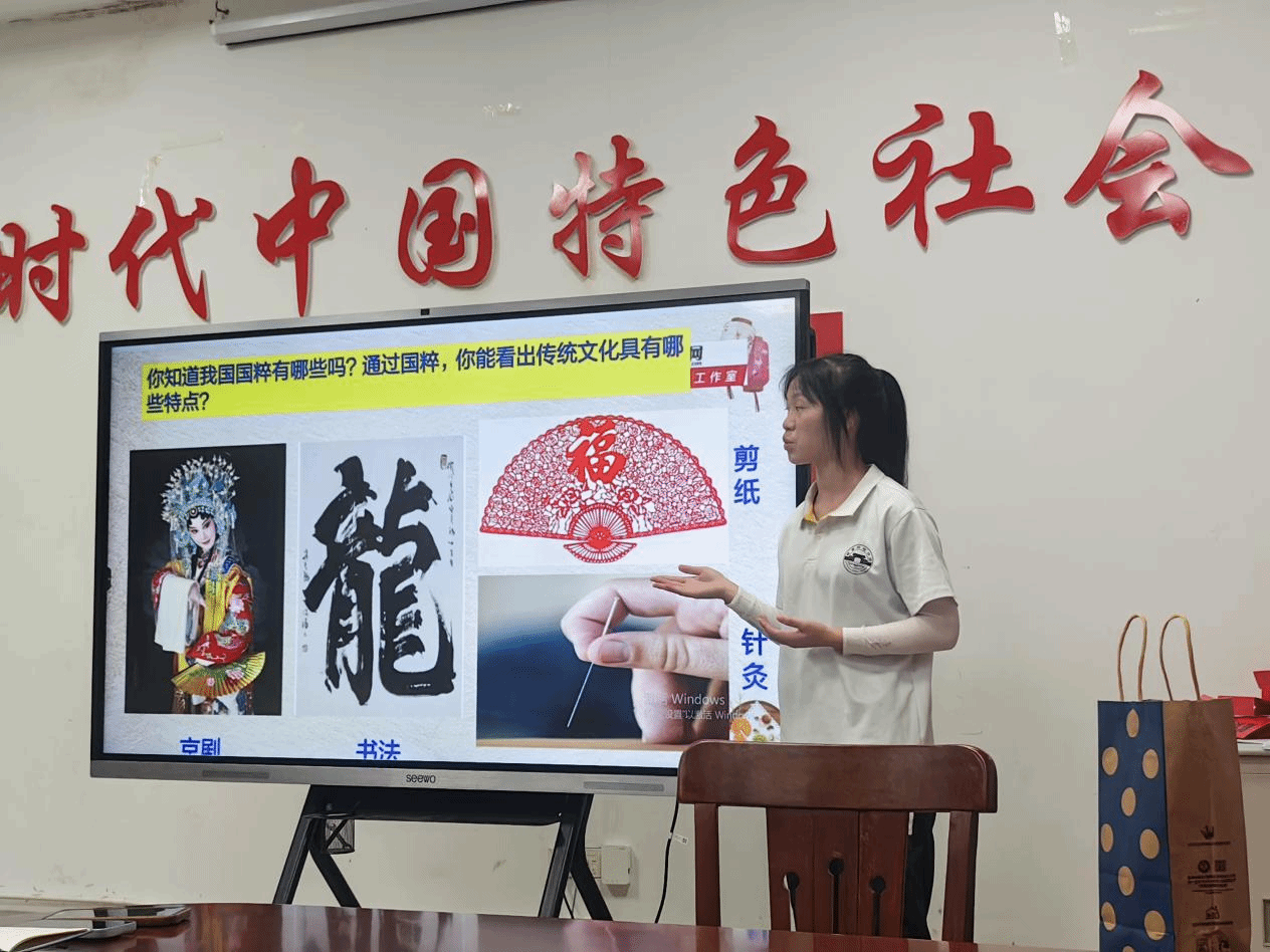 梁容同学介绍了我国传统文化中的国粹——京剧、书法、剪纸、针灸。讲述文化传承的重要性,总结出启示:创新方式,活化传承、多元共融,交流互鉴、树立自信,展现魅力。讲述当代大学生要积极参与校园文化活动、深入学习和了解传统文化、倡导和实践文明礼仪行为、创新和推广民族文化艺术。不忘初心才能开辟未来,善于继承才能善于创新。