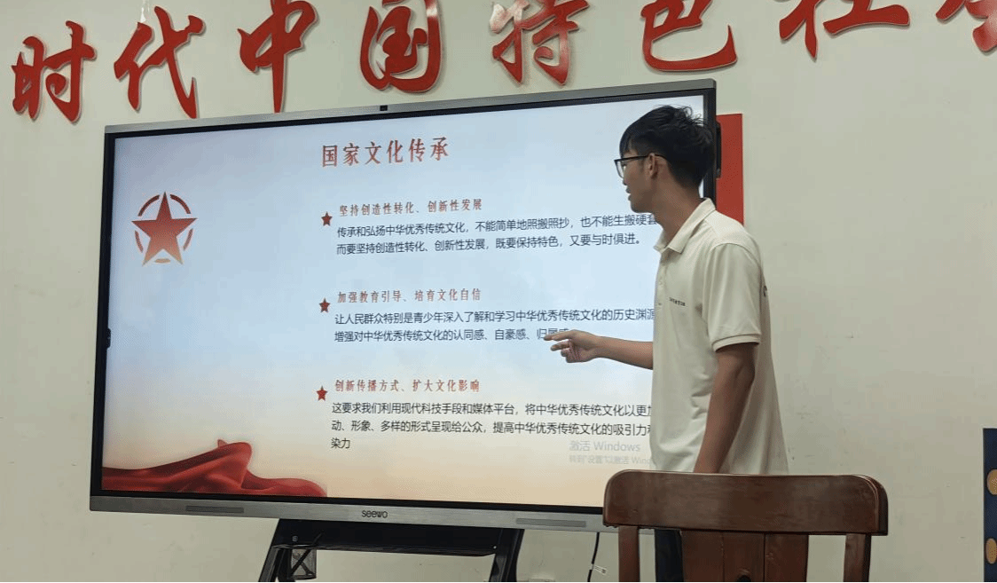 王科旺同学讲述文化传承的重要性,并从国家、社会、学校三个层面的启示,讲述我们要制定文化政策、推动文化创新、媒体宣传引导、社会组织参与、培养学生文化自信等。同时还说明要将传承与创新相结合,在传承经典文化的基础上,不断创新文化形式,让文化更加多样化和富有时代感。在文化传承中,要将传统与现代相结合,让传统文化在现代社会中焕发新的生命力。