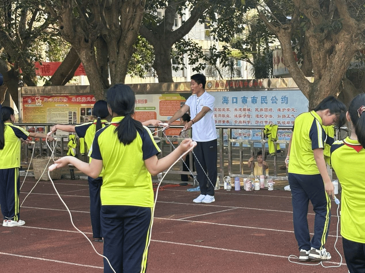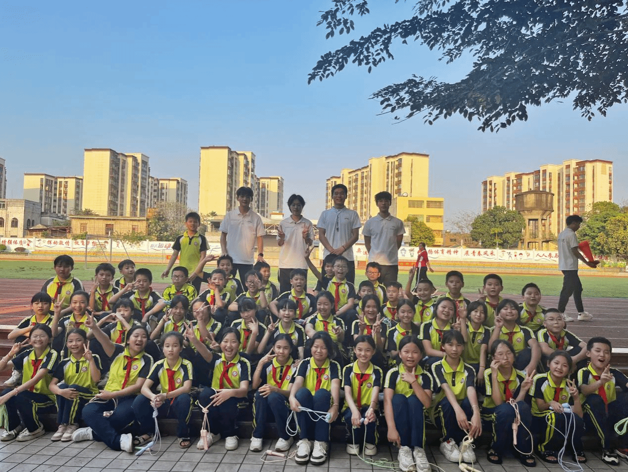 五年级的学生们则在邵士豪、杨函青、茹林豪、黄实贵四位志愿者的引导下体验了花样跳绳课程。伴随着欢快的音乐,学生们灵活变换不同的跳绳花样,共同挑战不同难度的动作,体验到了合作共赢的乐趣。在这个过程中,同学们不仅学会了跳绳技巧,还增强了彼此之间的友谊和信任。