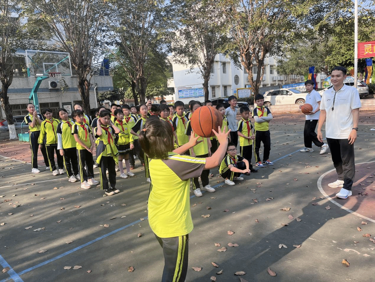 四年级的学生们在胡海基、陈天丽、符家辉、幸肖华四位志愿者的指导下学习篮球技巧。他们同样采用了游戏的方式进行教学,让学生们在不断的传球和接球中掌握体前传球技术要领。这个过程中,学生们不仅提高了自己的篮球技能,还学会了如何在团队中相互配合和支持。