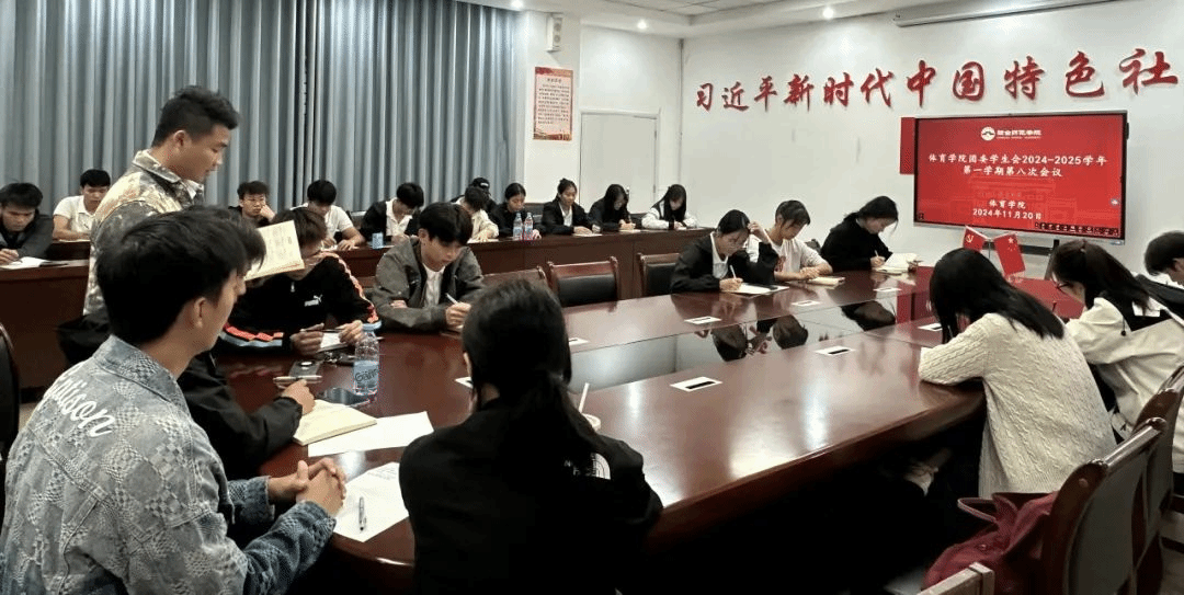 为了全面审视与评估前半学期的工作成效,总结经验教训,发现存在的问题与不足,进而优化工作流程,明确后半学期的工作方向与重点,有序地推进各项工作,2024 年 11 月 20 日中午,琼台师范学院体育学院团委学生会于体育学院党建办公室召开了 2024 - 2025 学年第一学期第八次会议,会议主要对本学年过去两个月的工作进行了全面复盘。体育学院团委学生会各部门负责人及成员代表参加了此次会议。
